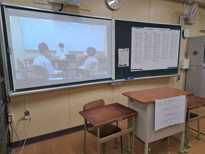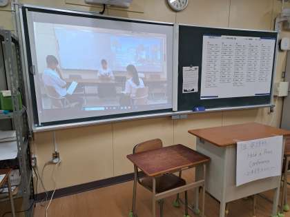 西館4階42教室は、3年英語・記者会見を開こう(偉人や有名人になりきって、記者会見や質疑応答した様子を撮影し、その動画を上映しました)です。