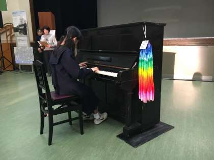 12月5日(土)に、西区民センターで「被爆ピアノ体験演奏会」が開催され、本校から代表で3年生の榊 小春さんが参加しました。演奏曲は「幻想曲 さくらさくら」でした。本格的なピアノ伴奏で驚きました。おつかれさまでした。