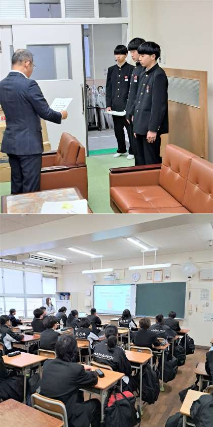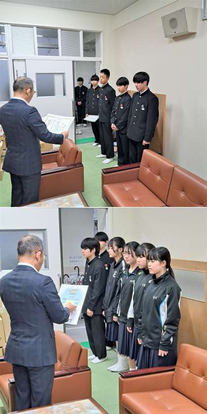 スポーツ活動で顕著な成果をあげ、教育長表彰者に決定された3名の生徒に、表彰状の伝達を行いました。吹奏楽部と男子バスケットボール部への賞状伝達も行いました。