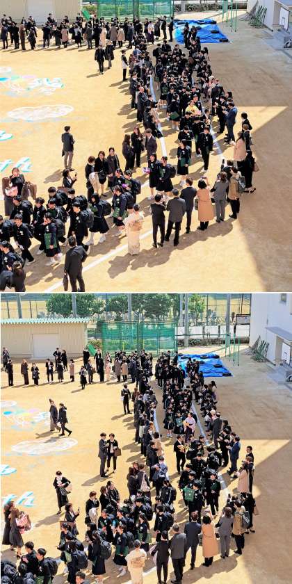 運動場に卒業式参列者で花道をつくり、拍手とエールで卒業生を送り出しました。