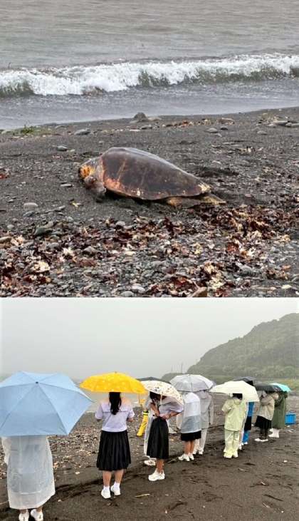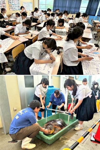 ウミガメにつける手紙を書いてところです。ウミガメの計測をして、最後にウミガメを海に放流しました。雨の中でしたが、みんなでお見送りをしました。