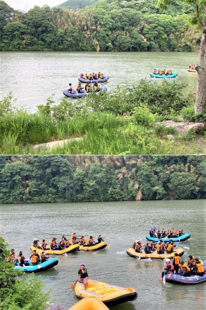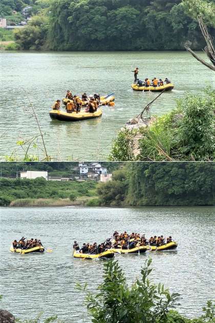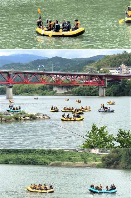 更衣をすませて、乗船ポイントに移動し、ラフト(ゴムボート)に乗り込みました。流れのないポイントに変更となりましたが、オールで水をかけあったり、ラフトを大きく揺らしたり、競争をしたりと、それぞれで楽しい時間を過ごしています。