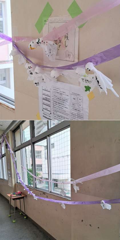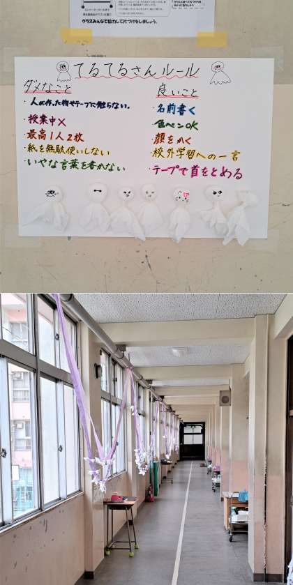2年生教室前の廊下に、数日前からてるてる坊主が。