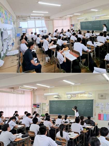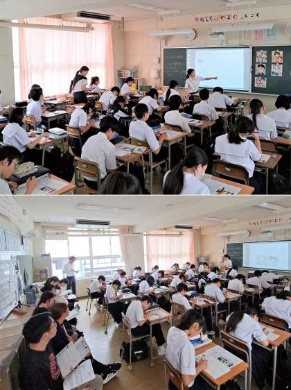 6月12日、3年数学(平方根・数の世界をさらにひろげよう)、2年美術(魅力を表す似顔絵)での教育実習生による研究授業の一コマです。すべての研究授業を終えて、放課後には指導教官等とともに反省会が開催されました。