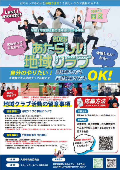 大阪市教育委員会・令和7年度 部活動の地域移行モデル事業「2025 あたらしい地域クラブ」の最新のチラシが届きましたので、学校ホームページに掲載しています。配布文書一覧をご覧ください。