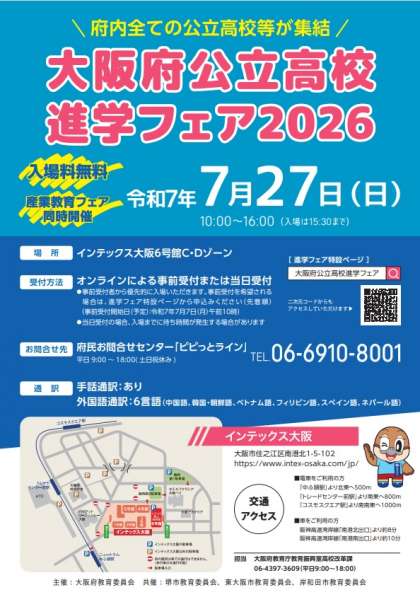 7月27日に開催される「大阪府公立高校進学フェア2026」のチラシが届きましたので、学校ホームページに掲載しています。配布文書一覧をご覧ください。事前受付は7月7日午前10時開始予定とのことです。