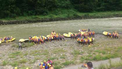 ラフティング終了後はシャワーを浴びてから制服に更衣し、バスに乗車して宿舎のグリーンプラザ白馬へ向かいます。