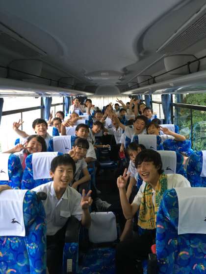 ラフティング終了後、グリーンプラザ白馬へ向かうバス内での笑顔の記念写真です♪