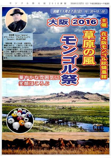 来たる11月27日(日)10:30〜15:00に靭公園にて、大阪2016 草原の風 モンゴル祭(主催 在大阪モンゴル総領事館)が開催されます。