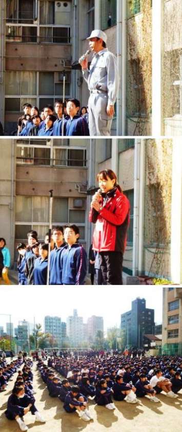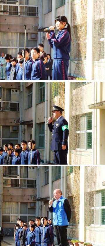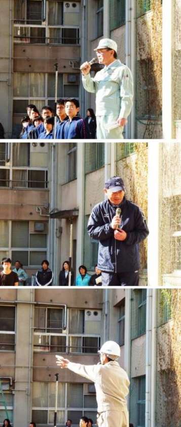 合同訓練終了後に、全員が運動場に集合し、各訓練ごとにグループ代表の生徒が訓練報告を行い、各訓練を担当していただいた関係諸機関の代表の方々から総評をいただきました。