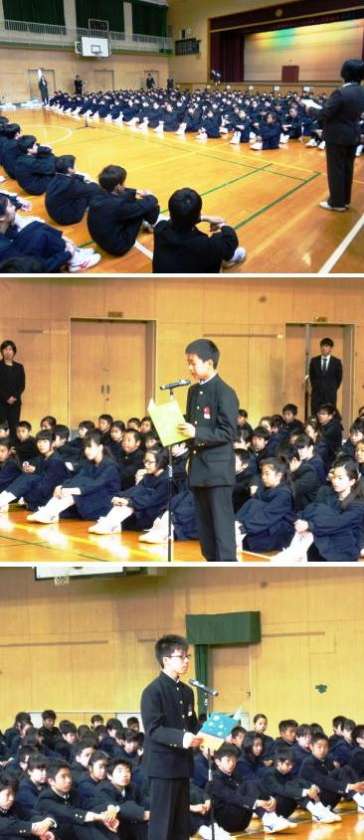 その後、全員が体育館に移動し、まずは着任式で新転任の教職員の紹介が校長先生から行われました。離任した先生方を含め、詳しくは本日の配付プリントでご確認ください。