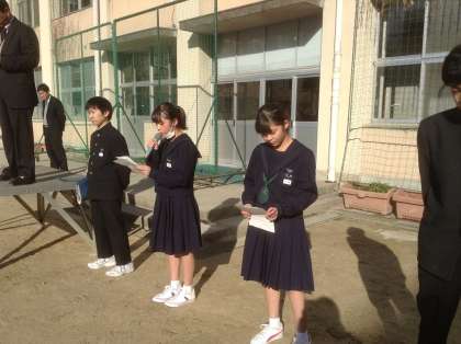 最後に、「最後だとわかっていたなら」という本の詩の紹介がありました。この詩は13年前の9月11日後に、アメリカのニューヨークから全世界に発信されました。この詩の朗読は、生徒会の松崎会長、松崎副会長の二人が担当しました。「あなたが眠りにつくのを見るのが 最後だとわかっていたら わたしは もっとちゃんとカバーをかけて 神様にその魂を守ってくださるように 祈っただろう…」と。この詩には、今という時を大切に、そして人に対しての優しさを謳っているように聴こえますね。