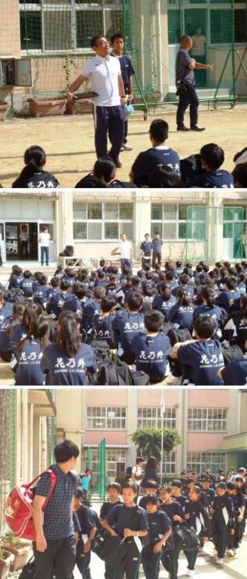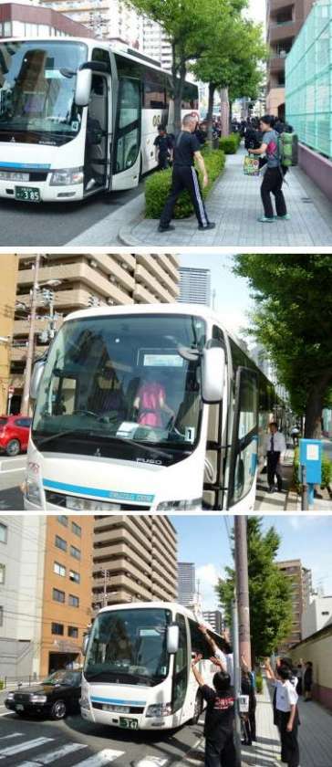 「元気よく」を合言葉に、4組が分乗した4台のバスが大阪府立少年自然の家に向かって出発しました♪