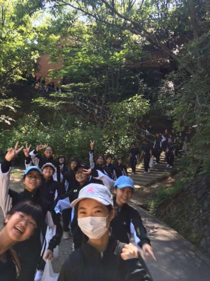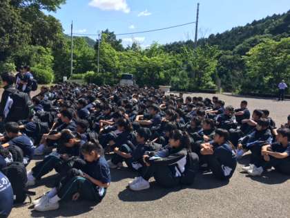 つどいの広場に集合し、野外炊飯の活動についての説明を聞いています。この後、第二炊飯場へ移動します。