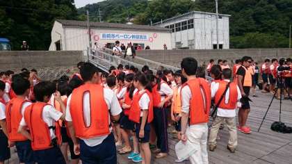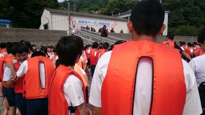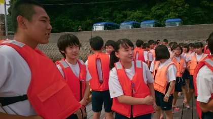 みんなビーチサンダルと体操服にライフジャケットで準備万端!