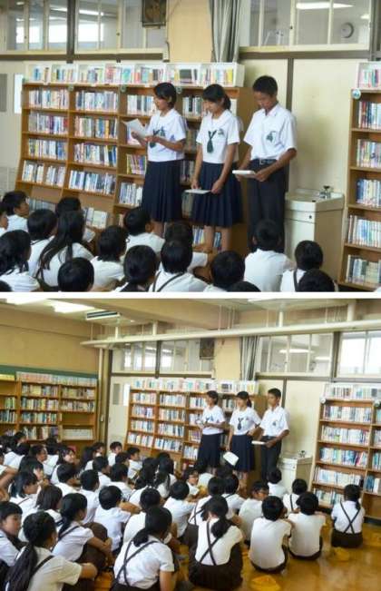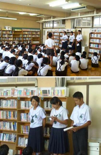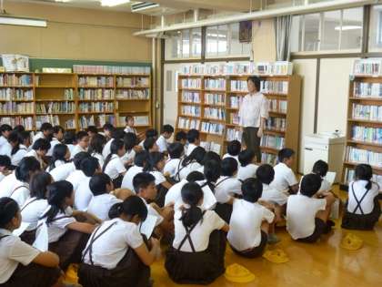 授業見学の後、全員が図書室に戻り、生徒会の先輩たちから花乃井中学校の紹介をしてもらいました。