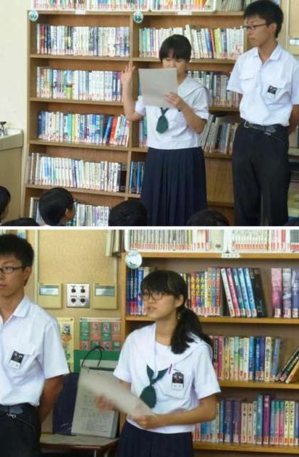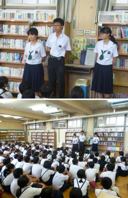 授業見学の後、図書室にて、生徒会の先輩たちから花乃井中学校の紹介をしてもらいました。