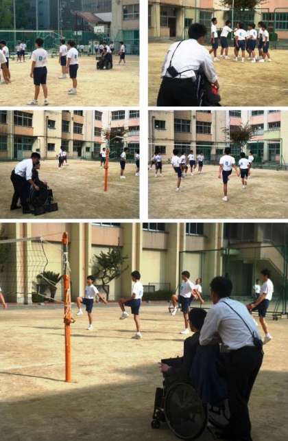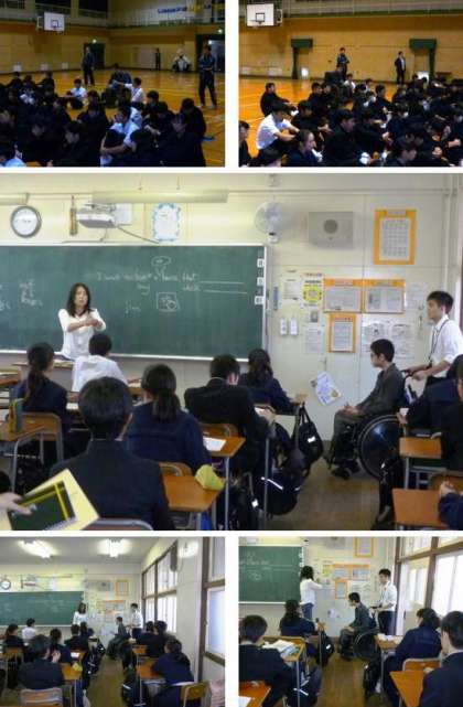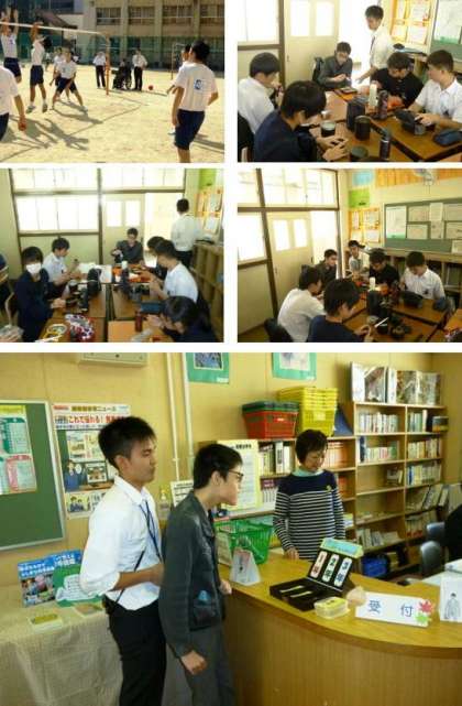 写真は3年4組での昼食と図書館、5限目保健体育(バレーボール)、6限目性教育〔体育館〕と終学活の様子です。