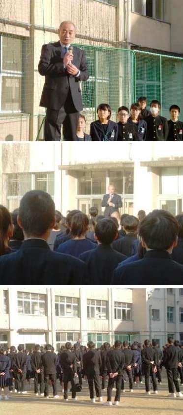全校生徒とのあいさつの後、文田校長先生から一昨日の「防災訓練」についてのお話と「ほめられること」から「認められること」についてのお話がありました。