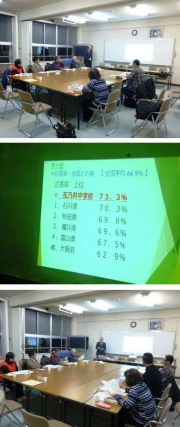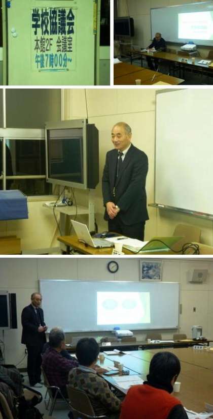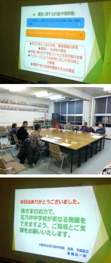 学校の現状について、文田校長先生よりパワーポイントを使って説明され、「全国学力・学習状況調査」結果、中学生チャレンジテスト結果、大阪市統一テスト結果、「運営に関する計画・自己評価」(中間評価)について協議されました。