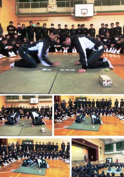 先週の1月12日(金)6限目、1年生では学校外で「競技かるた」を練習している4名の生徒たちが、実演を交えながら「競技かるた」を紹介してくれました。