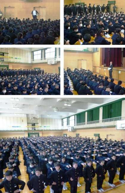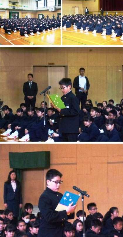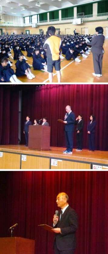その後、全員が体育館に移動し、まずは着任式で新転任の教職員の紹介が校長先生から行われました。離任した先生方を含め、詳しくは本日の配付プリントでご確認ください。