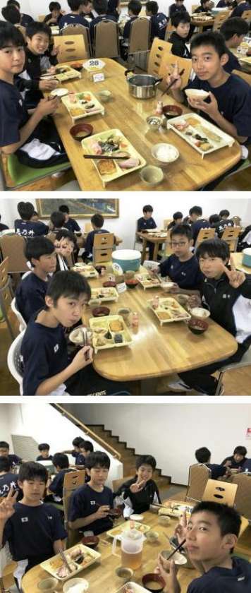 生活班で1テーブルごとに朝食を食べました。