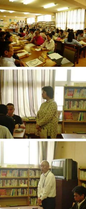 第1部の全体会は、花乃井中・西船場小・明治小・本田小の教員全員が図書室に集合して行われました。