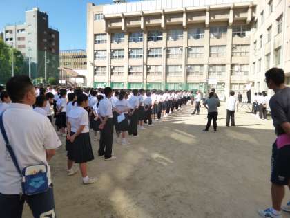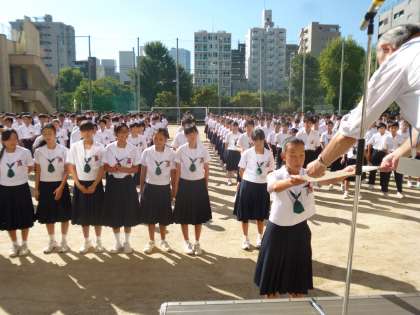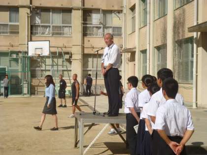 西区中学生スポーツ大会優勝の表彰と校長先生のお話です。