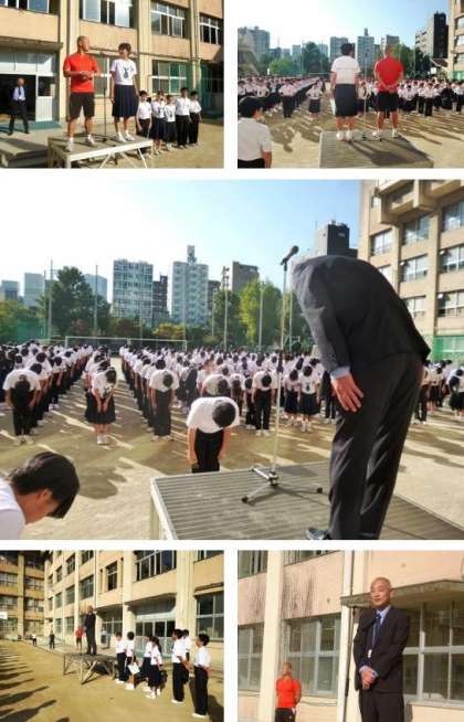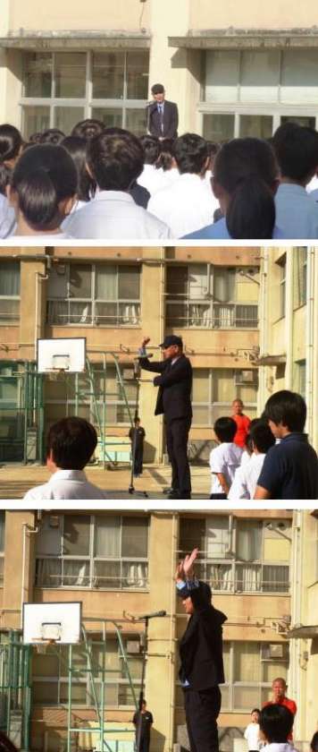 全校生徒と文田校長先生とのあいさつの後、文田校長先生からは「ルール」についてのお話がありました。野球の審判のゼスチャーやかけ声を交えながら熱弁されました。続いて末弘先生からもマナー・エチケットについてのお話があり、「思いやり」の大切さについてお話されました。