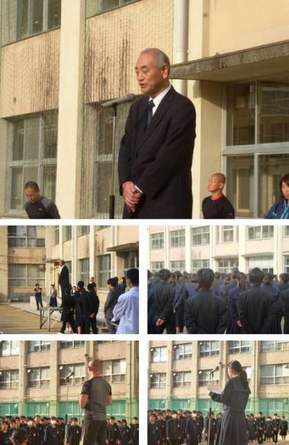 文田校長先生のお話では、ソフトボール部の頑張りを筆頭に各部活動で生徒たちがすごく頑張っているお話や昨日に津波高潮ステーションで行われた「ぼう災のつどい」で吹奏楽部が素晴らしい演奏を披露したこと等をお話されました。