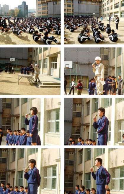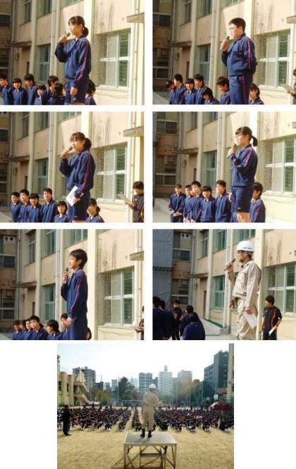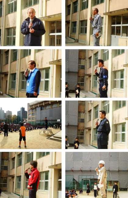 合同訓練終了後、全員が運動場に各訓練グループで集合し、各訓練ごとにグループ代表の生徒が、どのような活動をしたかの報告と感想を発表しました。