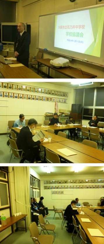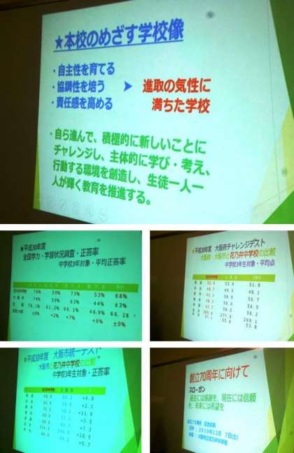 学校の現状について、文田校長先生よりパワーポイントを使って説明され、「全国学力・学習状況調査」結果、中学生チャレンジテスト結果、大阪市統一テスト結果、「運営に関する計画・自己評価」(中間評価)について協議されました。