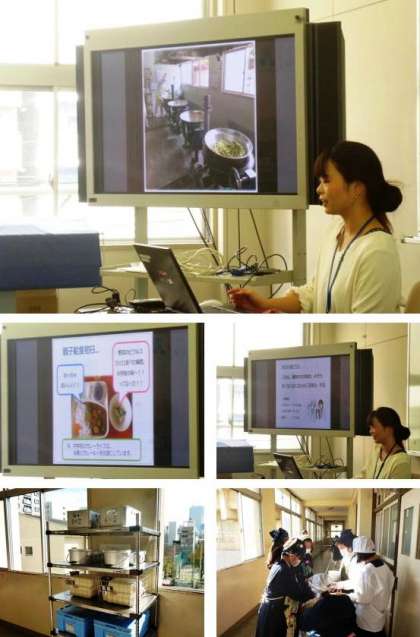 12時より会議室にて九条東小学校栄養教諭の福田先生に学校給食についていろいろとお話をしていただき、続いて1・2年生の給食準備を見学しました。