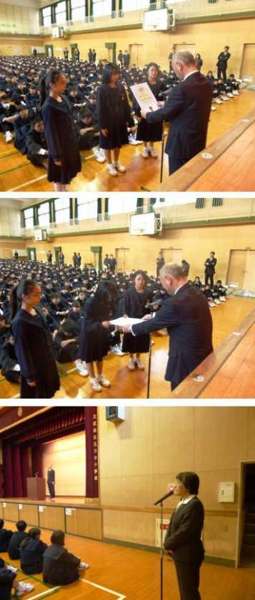 始業式前には昨年末に行われた大阪府アンサンブルコンテストで金賞を獲得した吹奏楽部のフルート三重奏の3名への表彰が行われました。