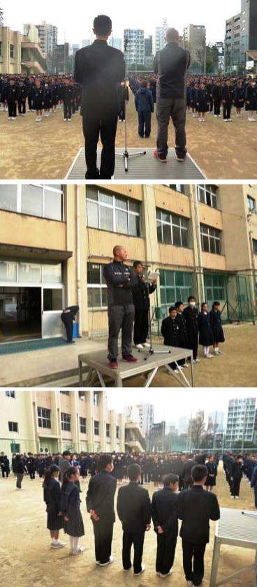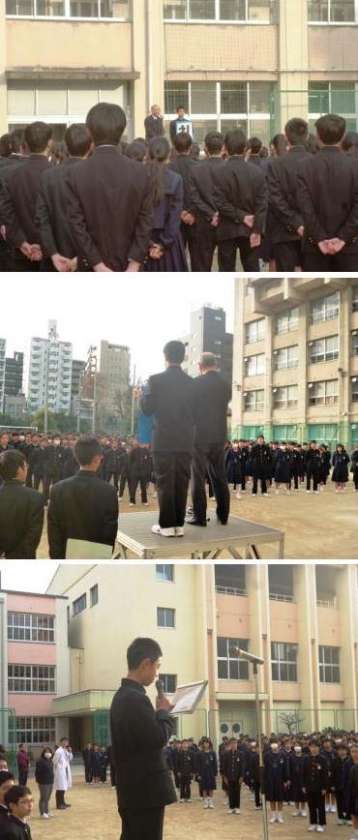 本日1月15日(火)の全校集会では、全校生徒とのあいさつの後、文田校長先生から「礼」について、礼儀・あいさつ等いろいろなお話がありました。