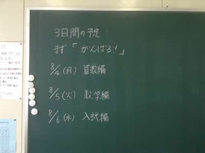 8月4日、本日は1年「分数・少数を克服して計算名人に!」「計算マスターをめざして」の2コースと2年「理科の復習をしよう」の夏休みチャレンジ講座が実施されました。暑さに負けず、基礎・基本の定着に頑張っていますよ!