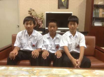 8月29日放課後、1年生水泳部の3名の生徒が校長室へ来てくれました。この3名は、8月初旬に、部活動帰りの同級生が帰宅途中に気分が悪くなり困っていたところに出会い、すぐに2名は学校に報告、1名は付添い公園のベンチで休ませるという見事な連携プレーを見せてくれました。すぐに先生方が駆けつけて対処したため大事にはいたりませんでした。本当にありがとうございました。これからもみんなのために様々な場面で活躍してくださいね。ご紹介しておきます。1年1組芝君、4組佐藤君、5組井原君でした。