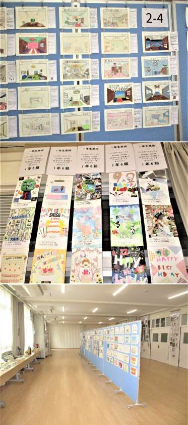 1年「バースデーコラージュ」、2年「幸せのマイルーム(遠近法と色鉛筆による作品)」、3年「光のポートレート(スクラッチ技法による肖像画)」です。