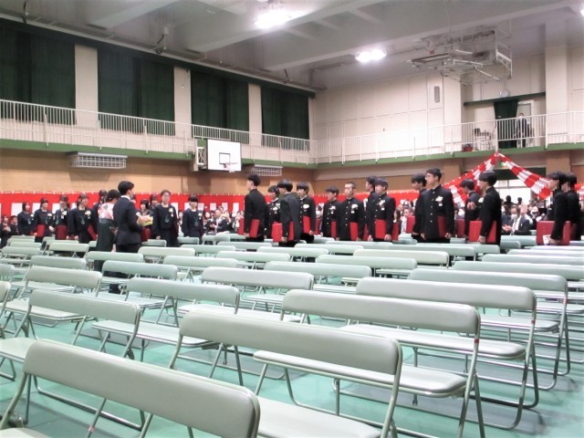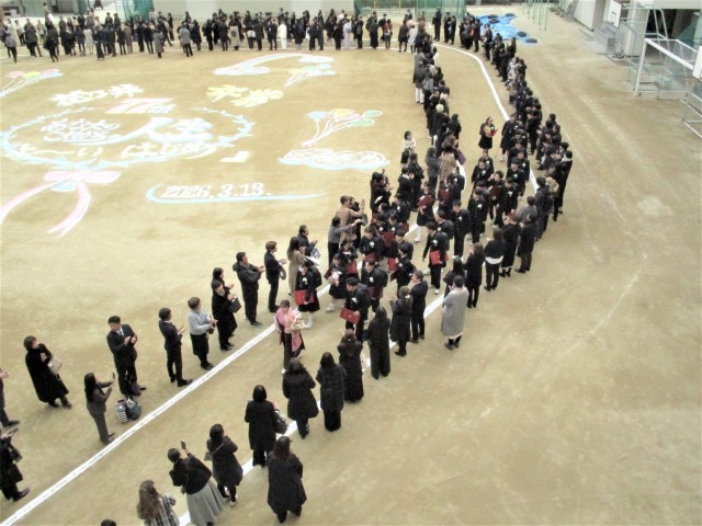 その後、運動場に保護者・教職員で作った花道を通って中学校を後にしました。