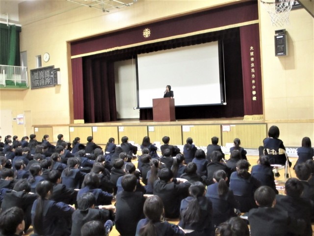 「なぜ勉強しなければならないのか」各教科の学びの目的から、学ぶことの意義について校長から講話がありました。自分の変化・成長を客観視し、次の目標を設定して新学年を迎えてください。高校受験はもちろん、将来の自分のライフスタイルを想像し、より良く生き抜くための力を学びを通して身につけてください。