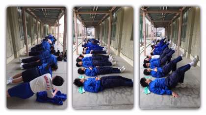 本日は運動部を中心に紹介しています。水泳部はまだプールに入水できないので、陸トレの様子です。
