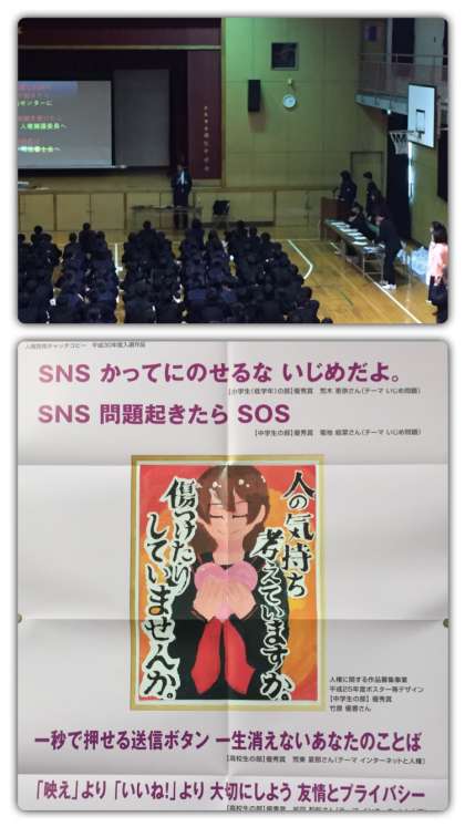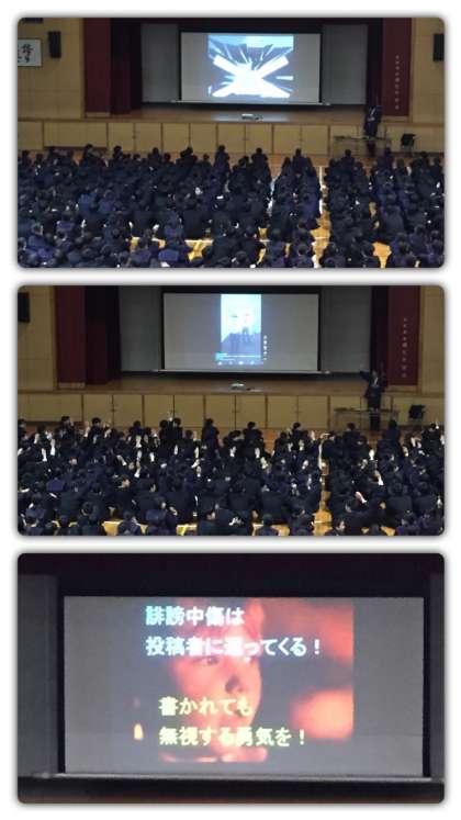 生徒たちの間でもかなり普及しているスマホのやインターネット機器についてですが、どのようなことに注意したら安全に扱うことができるかについて教えていただきました。便利だと思って使っていても、設定の方法により個人情報が全世界に流出していたり、知らない人とたくさんつながってしまっていたり、お話を聞けば聞くほど自分のスマホは大丈夫なのかなという不安にも陥ってしまします。とにかく、初期設定のままだと自分の情報が流出してしまいますので、設定をしっかりと行ってください。