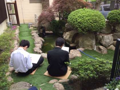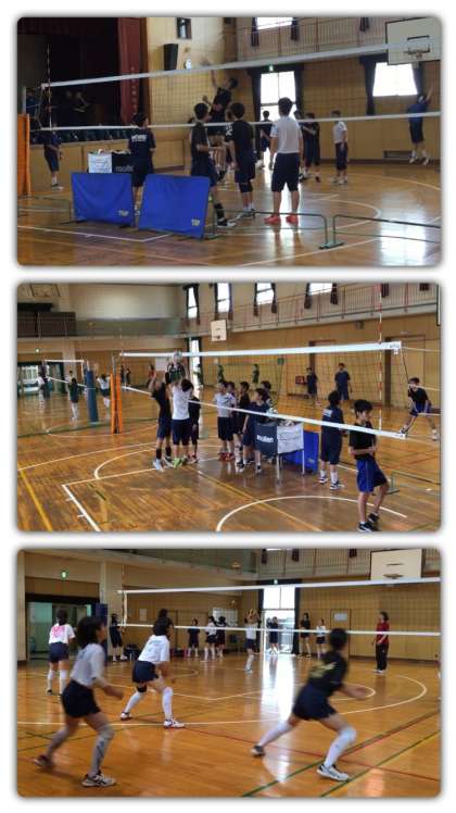 写真は、玄関の池を写生している美術部の様子、男子バレー部、女子バレー部の様子です。