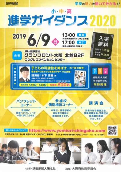 読売新聞主催の進学ガイダンスが開催されます。私立高校のことだけでなく、効果のある勉強方法、受験対策などの講演会、相談コーナーも開催されますので、ご案内いたします。 ※申し込み不要・入場無料
