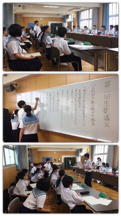 第2回生徒議会を多目的室で行いました。生徒会役員、各委員会の代表、各クラスの委員長が一堂に会して月に1回行われています。まず、各専門委員会からの報告があり、その後、「時間を守ろう」の取組の結果を各クラスから発表したり、現在の問題について解決方法を話し合ったりしています。1年生の敬語ができていないことや忘れものが多いこと等の対策を2・3年生からアドバイスをもらっていました。クラス代表の皆さんはどうしたらいいか真剣に考えていました。引き続き今月も「時間を守る」ことについて取組を進めることとなりました。全校生徒の皆さんも「時間を守ろう」、特に「チャイム着席」「集会遅刻をなくす」からしっかりと協力して、良き堀江中学校を作りましょう。