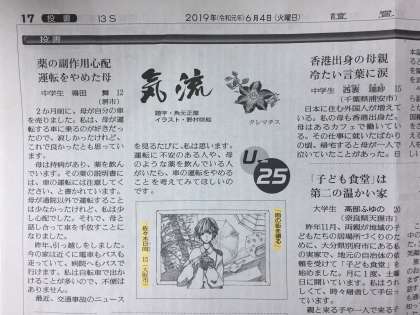 6月4日(火)読売新聞の朝刊の「気流」というコーナーのU-25に、美術部3年生の佐々木日向さんのイラストが採用され掲載されました。これからも素敵なイラストを描いてくださいね。