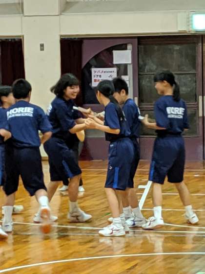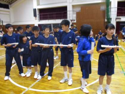 室内オリンピック 第四競技は みんなで協力!橋渡しリレーです。