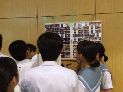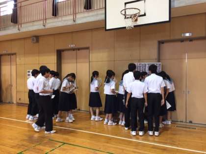 修学旅行の写真の見本が出来上がってきました。5限目に体育館に掲示された写真をクラスごとにまわって閲覧し、購入したい写真を吟味していました。