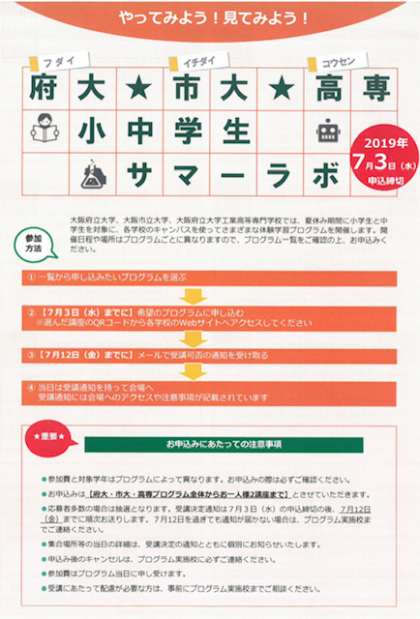 さて、夏休み期間に、大学や高等専門学校で、小中学生を対象とした体験学習プログラムが開催されます。興味のある人はプログラム一覧をご確認の上、お申し込みください。申し込み期限は7月3日までです。